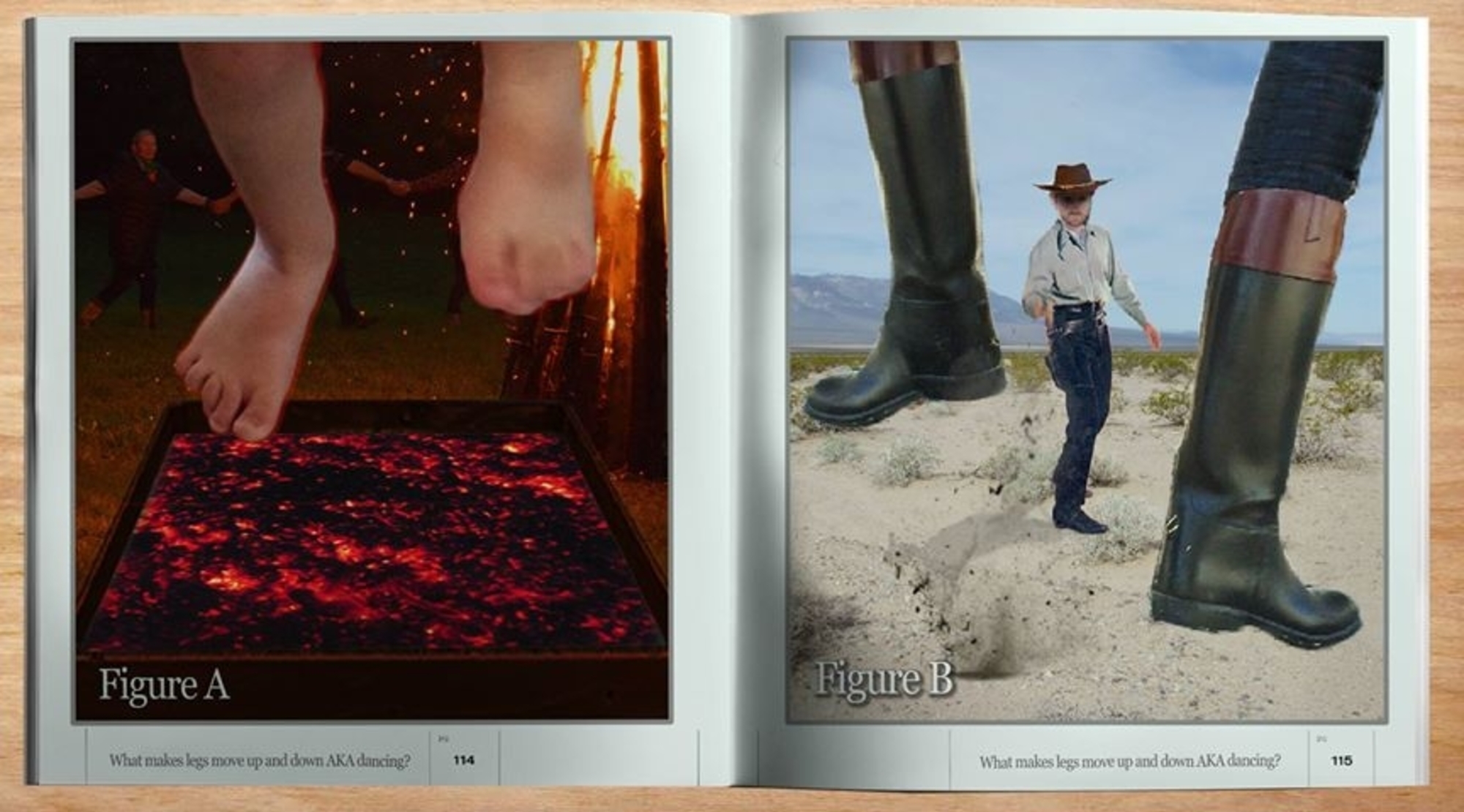 The first team discovered the placement of a flame directly under a bed of coals allows non-dancers to step onto the surface with bare feet and trigger an intense heat reaction, launching one foot upwards. In order to maintain balance, the other foot will remain on the hot coals until the first foot returns to the surface. Once the first foot returns, the second will react to the heat and fly up accordingly. This cycle repeats.