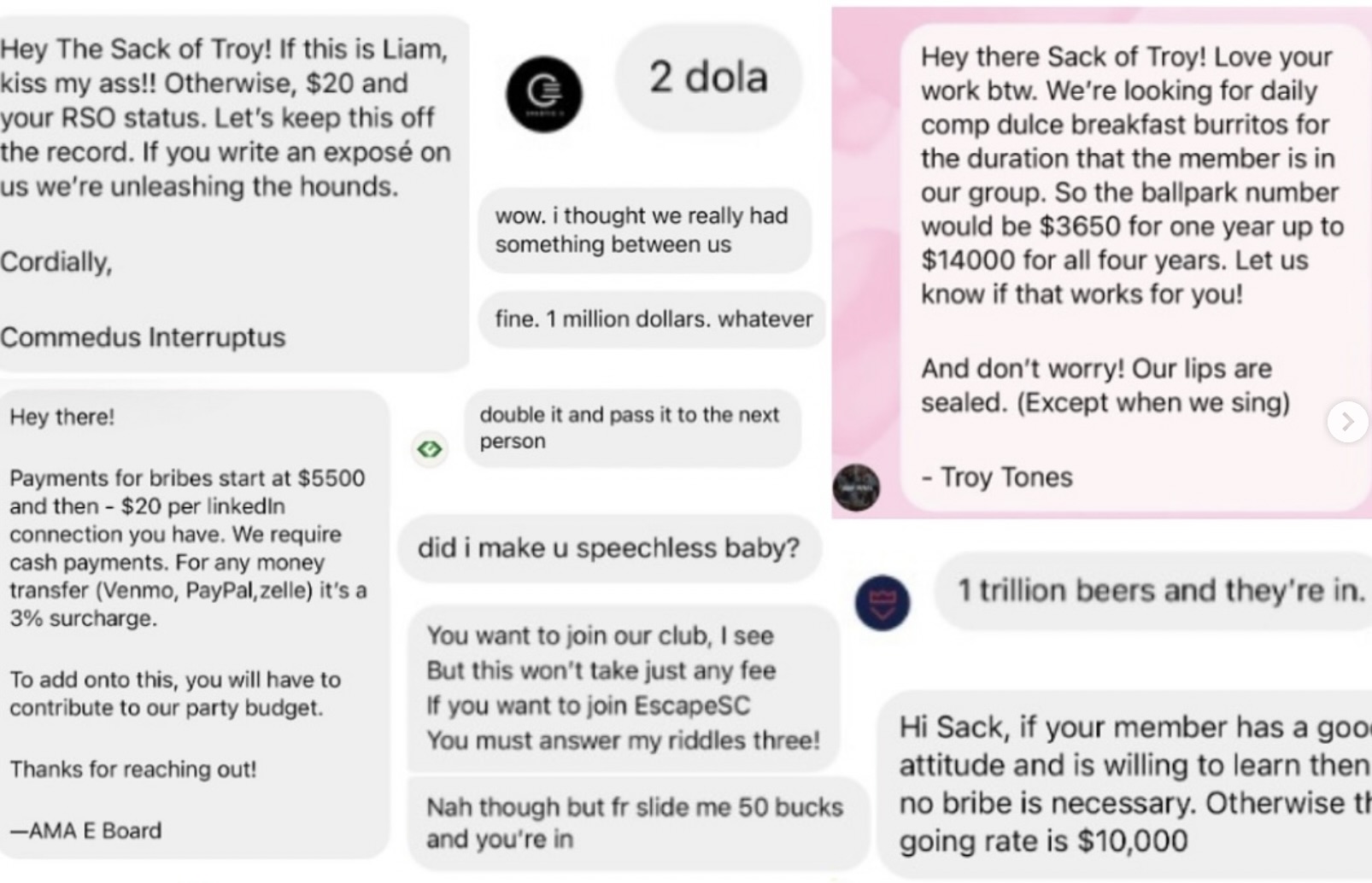 After seeing all these prices, you may be thinking “which club has the best deal?” And that’s easy. The Sack of Troy, of course!!!!! We’re better than all these other stupid clubs by a mile and we’re looking for new writers. So apply now at https://www.sackoftroy.com/join-us/. And if you’re not confident in your writing, we also love to accept bribes. Comment or DM us your bribe price, highest bidder gets in. Now feel free to continue swiping to see proof that these bribe prices are real and take a look behind the curtain of our very serious investigation tactics.