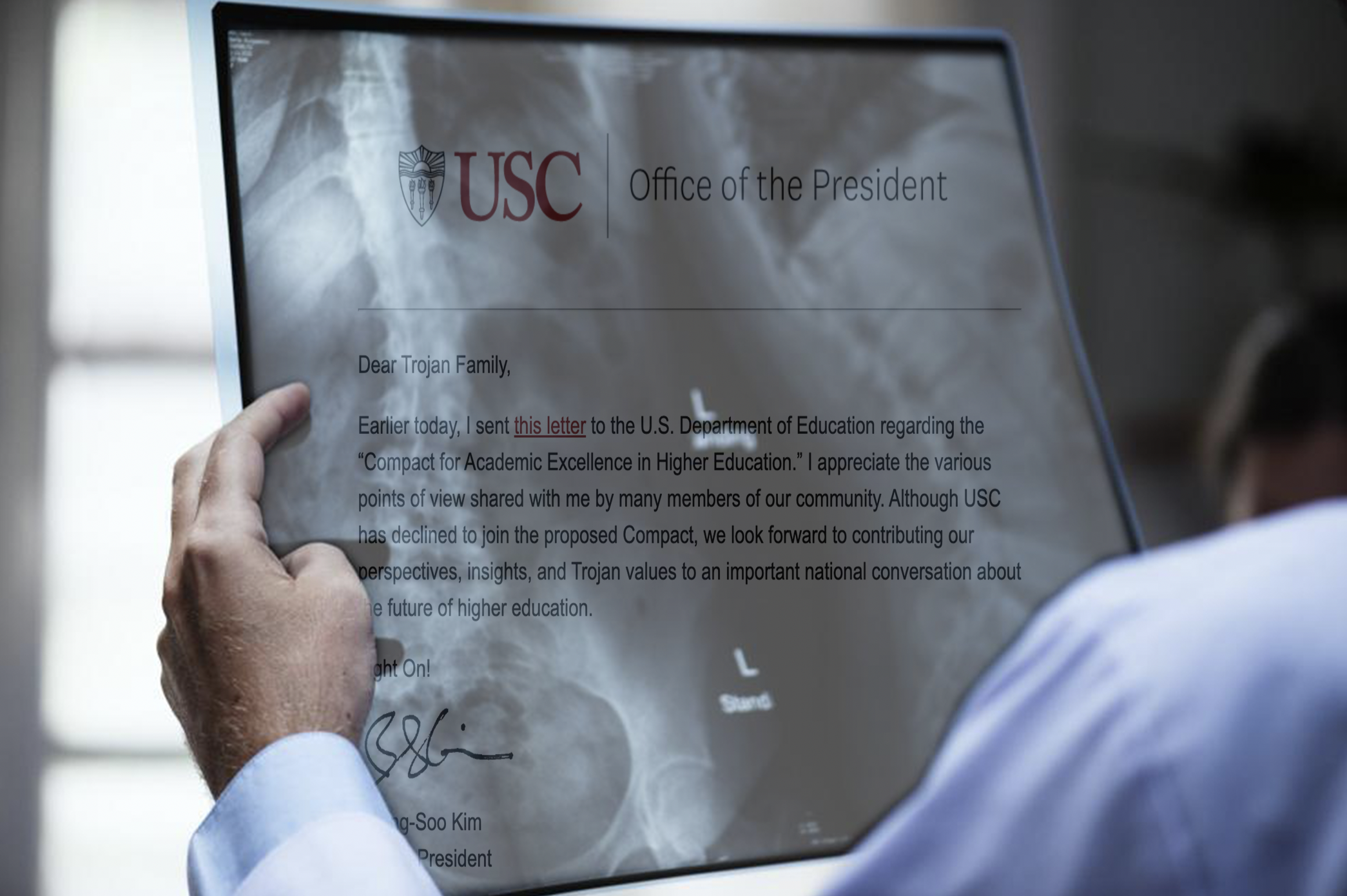 LOS ANGELES, CA – Ferrel Kolt, M.D., Beong Soo Kim’s primary care physician, just made a groundbreaking discovery: despite the Interim University President doing literally anything besides hiring a PR agent and saying “free speech is good, actually,” recent behavior shows that he may in fact have a functioning spinal cord.